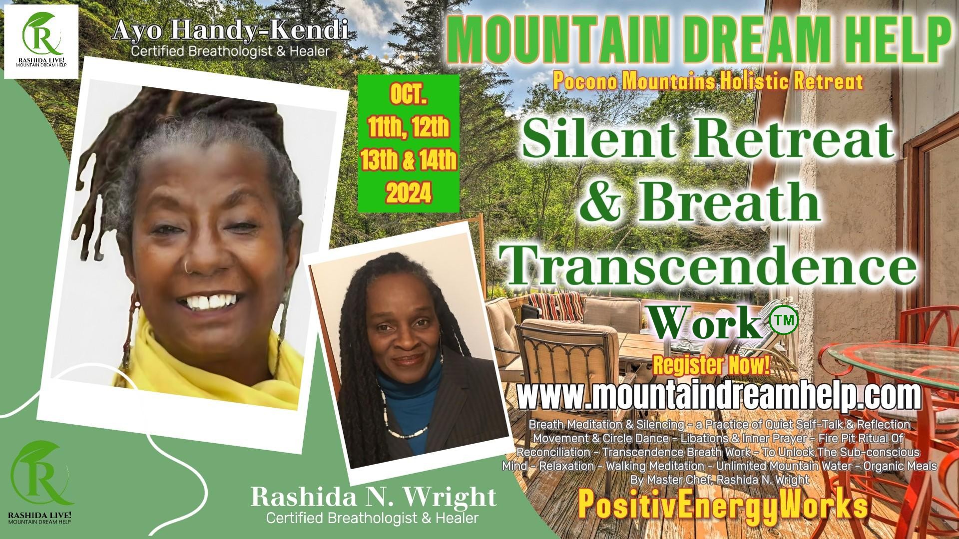 Experience a transformative wellness retreat like no other at Mountain Dream Help, nestled in the breathtaking Pocono Mountains from October 11th to 14th, 2024. This exclusive four-day event offers a unique opportunity to reconnect with nature and rejuvenate your mind, body, and spirit. Immerse yourself in a carefully curated program featuring silent retreats for deep introspection, invigorating breathwork sessions led by world-renowned breathologist Ayo Kendi, and high-level raw food chef classes conducted by the esteemed Rashida N. Wright. Our diverse wellness modalities are tailored to individual needs, ensuring a personalized and enriching experience for each participant. Surrounded by the serene natural beauty of the Poconos, you’ll have ample opportunities to enhance your healing process and interact with world-class wellness experts.