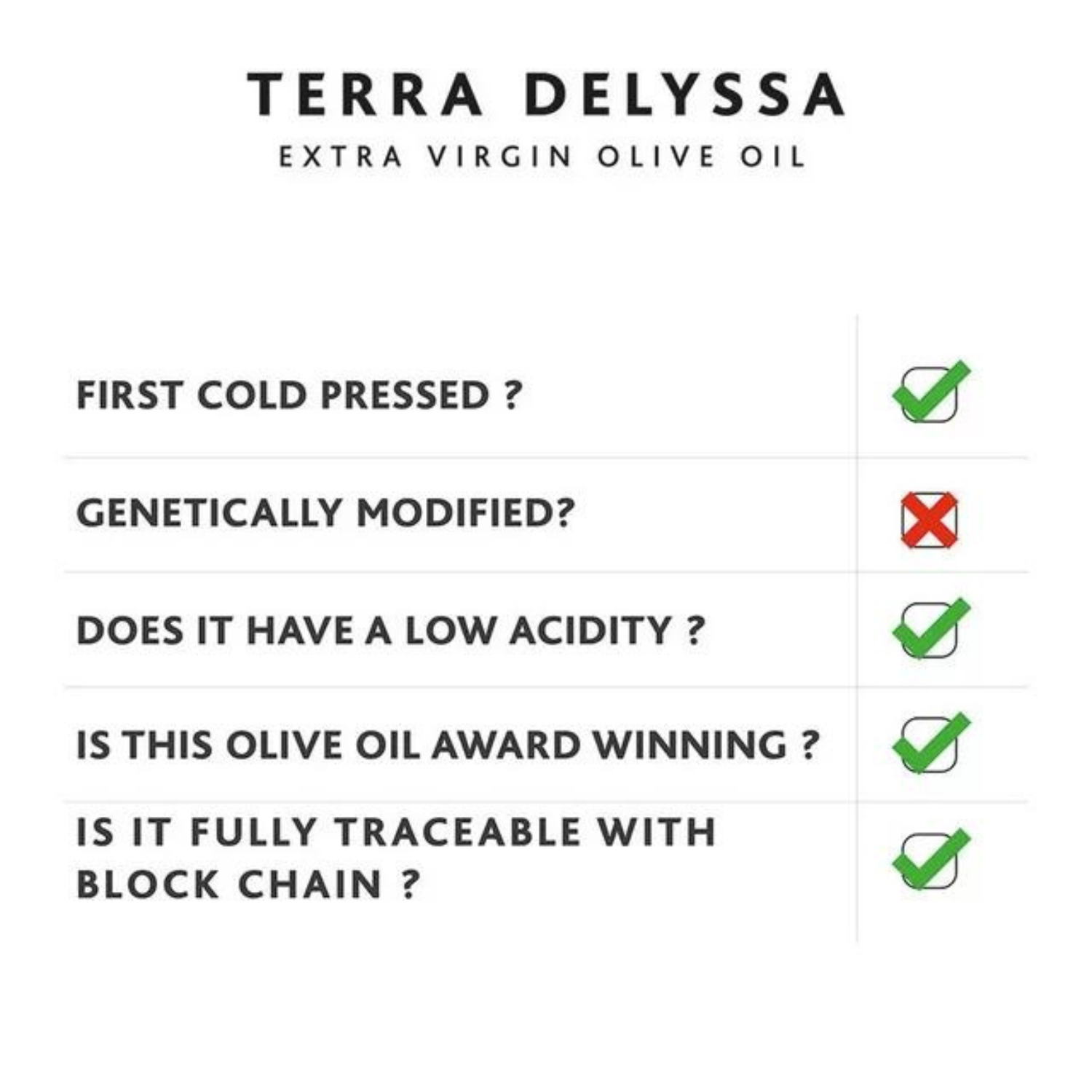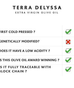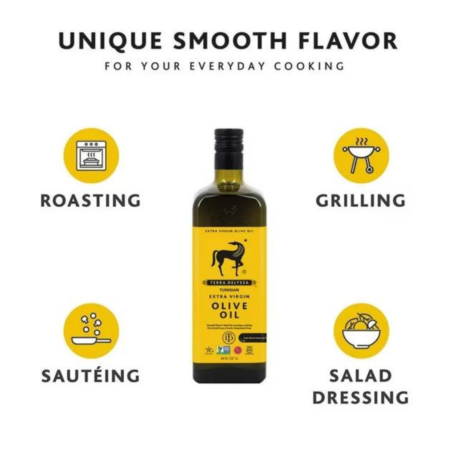Terra Delyssa first cold pressed extra virgin olive oil is perfect for all types of cooking. Its smooth, mild and fresh flavor complements all dishes including dipping, salad dressings, marinades, and anytime your recipe calls for olive oil. Award winning Terra Delyssa is the essential EVOO customers have grown to love and trust in their kitchens for years. Made with 100% Tunisian olives, the olives are grown without the use of pesticides and hand harvested by the same farmers who first cold press the fresh olives within 4 hours of harvest. Fresh pressed Terra Delyssa Extra Virgin Olive Oil has a less than 0.4% acidity and is naturally rich in antioxidants and high polyphenols. The quality of Terra Delyssa extra virgin olive oil is controlled from the orchard to the filling in a dark glass bottle with the data encrypted by IBM Food Trust Block Chain. Scan the QR code on the label to follow the journey from our orchards.